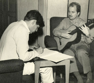 Luiz Bonfá. As a composer and performer was an exponent of the bold, lyrical, lushly orchestrated, and emotionally charged samba-canção style that predated the arrival of João Gilberto’s more refined and subdued bossa nova style. A musician of virtuosity, subtlety, and passion, guitarist Luiz Bonfá (1922-2001) ranks among the key architects of the bossa nova sound and the greatest masters of Brazilian popular of the 20th century. Reahearsing with friend Tom Jobim. Bonfá’s style on the guitar moved away from the classical focus on melodic intricacy towards an approach Brazilian rhythms, while maintaining the poise and beauty of the classical sound. His early twenties saw a rapid development in his compositional style, which, coupled with his technical talent, gave rise to numerous popular songs, including “De Cigarro em Cigarro,” “Sam bolero,” and “Uma Prece.” From the movie Copacabana Palace, Luiz Bonfa with Joao Gilberto and Tom Jobim. A French-Italian-Brazilian fil directed by Steno. Bonfá spent the next fifteen years living on and off in the USA, going home occasionally to record or relax. During one such month off in Rio in the late 1950s, Luiz was approached by French director Marcel Camus to write a theme for the main character of his film Orfeu Negro (“Black Orpheus”), an adaptation of a Brazilian re-telling of the legend of Orpheus written by Bonfá’s friend and fellow musician Vinicius de Moraes. Bonfá composed a piece which, though not immediately liked by Camus, would become his most well-known composition. To this day, “Manhã de Carnaval” (“Morning of Carnival” or “Black Orpheus”) remain classics . Luis Bonfá worked with American musicians such as Quincy Jones, George Benson, Stan Getz, and Frank Sinatra, recording several albums while in United States. Elvis Presley sang a Bonfa composition, “Almost in Love”, in the 1968 MGM film “Live a Little, Love a Little”.